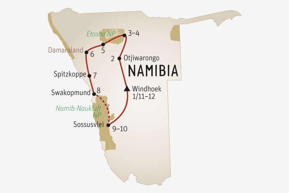 12ᴱ JOUR: Windhoek. Matinée libre. La chambre doit être libérée vers 10h00. Transfert anglophone non privé vers l’aéroport international pour votre vol retour. (Pd)
