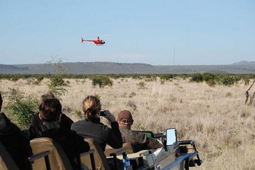 Geplant war, ein weibliches Breitmaul-Nashorn mit seinem Kälbchen zu finden. Das Muttertier war vor Jahren mit einem Satelliten-Band am Fuss markiert worden und dieses Band musste dringend ausgewechselt werden, da es mit den Jahren zu eng wurde und das Tier sich damit aufschürfte. Das Tier wurde seit zwei Wochen geortet aber konnte nie betäubt werden. An diesem strahlend sonnigen Tag im Mai sollte ein weiterer Versuch gestartet werden. Der Helikopter hob mit unserem Claudio Nauli ab und wir fuhren dem Heli in unseren Safari Fahrzeugen nach. Das Tier wurde im Norden des 75 000 Hektar grossen Madikwe Wildschutzgebietet vermutet und mit dem Helikopter wurde das Gebiet von oben gescannt.
