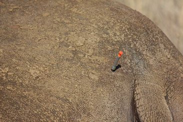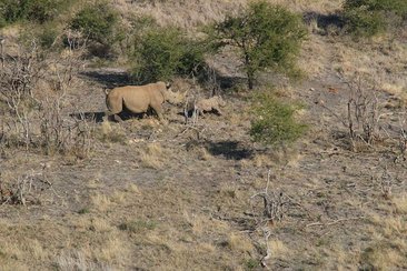 Via Funk wurden unsere Ranger informiert, dass das Nashorn und sein Baby aufgespürt wurden und der Tierarzt setzte aus dem Helikopter mit seinem Betäubungsgewehr an. Getroffen! Jetzt mussten wir nur noch in genügend Distanz warten, bis die muskuläre Injektion wirkte und das Mutternashorn wankend langsam in die Knie ging und unbeweglich wurde.