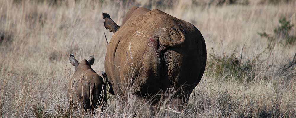Das im Gras liegende tonnenschwere Nashorn musste zur Seite gekippt werden, was dann mit der Hilfe von rund 6 Personen und mehreren Anläufen auch gelang. Nun konnte der Tierarzt das Band wegschneiden und die Verletzung säubern. Wenige Minuten später mussten wir bereits wieder in unsere Fahrzeuge einsteigen, den beiden Tieren wurde die Augenbinde entfernt und von Weitem konnten wir beobachten, wie sich Mutter und Kalb langsam wieder bewegten und kurz darauf friedlich grasend in die weite Savanne liefen.