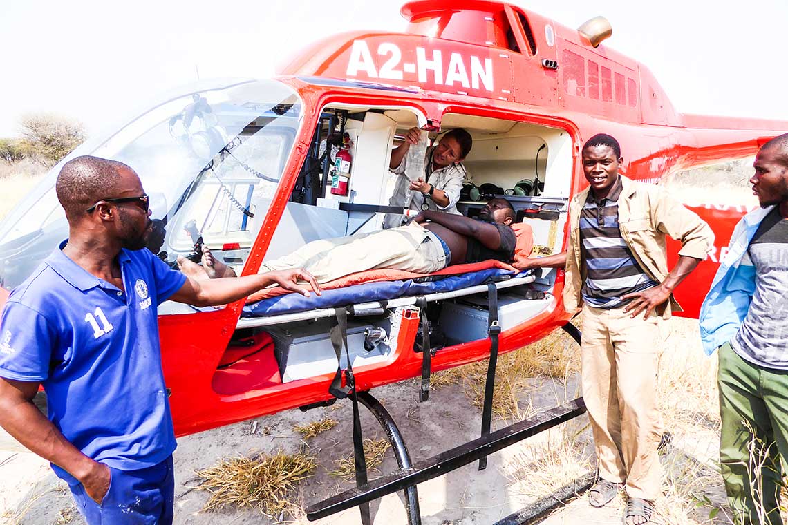 Um 14.50 Uhr ist der rote Helikopter der Okavango Air Rescue in der Luft, 45 Minuten später landet er am Unfallort, inmitten des Deltas, ringsherum Büsche, Gras, und da: der zerstörte Jeep. Mit voller Wucht hat das Elefantenweibchen den Wagen gerammt, ihn vor sich her gerollt und auf dem Dach liegen lassen. Die Frau wurde, wie in einer überdimensionalen Waschmaschine, durch das Innere des Wagens geschleudert. Die Folgen: Blaue Flecken, blind vor Schwellungen, Gesichtsfraktur. Innert Kürze verladen Misha Kruck und ihr Pilot die Patientin in den Helikopter, fliegen sie nach Maun und transferieren sie per Flugzeug weiter in die Hauptstadt Gaborone. Was früher unendlich lange gedauert hätte, gelingt jetzt innert Stunden. Bereits am Abend liegt die Patientin im bestausgerüsteten Spital des Landes - gerettet von der Okavango Air Rescue, von der Rega des Südens.