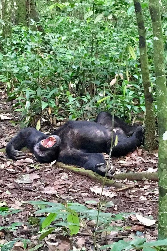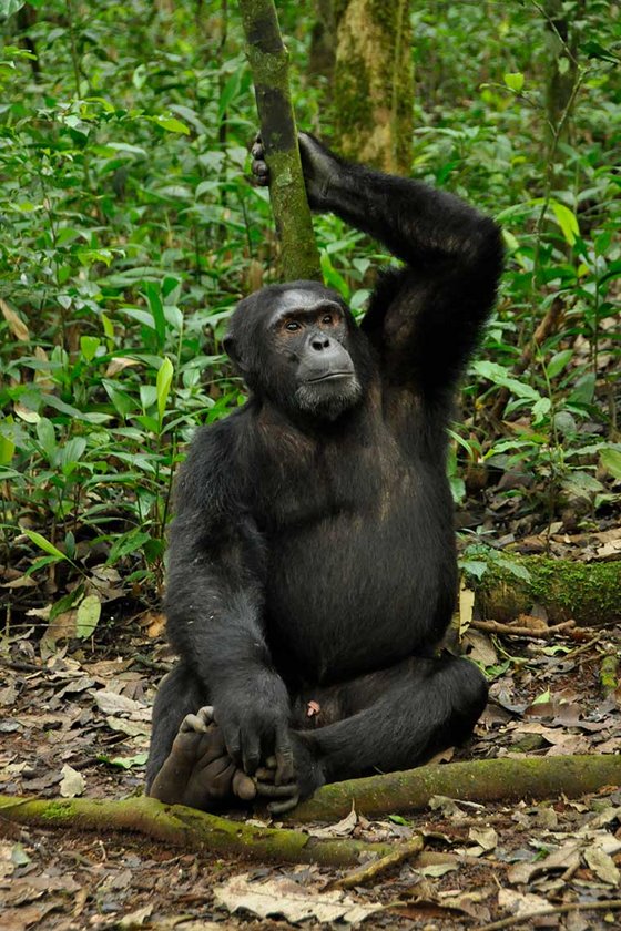 Er ist nicht das grösste aber das cleverste Männchen der Gruppe und daher der Chef. Seine Ausstrahlung, sein Blick, seine Gelassenheit, ach einfach alles an ihm fasziniert mich, es ist fast wie Liebe auf den ersten Blick. Ich versuche ihm tief in die Augen zu schauen, aber das könnte ja jede, so schnell ist Totti nicht beeindruckt und schaut desinteressiert wieder weg, registriert aber trotzdem jede unserer Bewegungen. Er bemerkt natürlich sofort, dass er sicher die Kontrolle über mich hätte, wenn ich ein Schimpansen Weibchen wäre. Seine Schimpansengruppe ist in der Nähe, turnt verspielt in den Wipfeln. Plötzlich öffnet Totti den Mund und fängt an zu brüllen. Sein Gebiss beeindruckt mich und sein Macho-Geschrei noch viel mehr. «Uuuuuaa, uhuhuhuhuh, uuuuuuuaa». Lautstark brüllend rennt er zum nächsten Baum und lässt alle mit einem wilden Trommelwirbel wissen, dass er hier das Alpha-Tier ist.