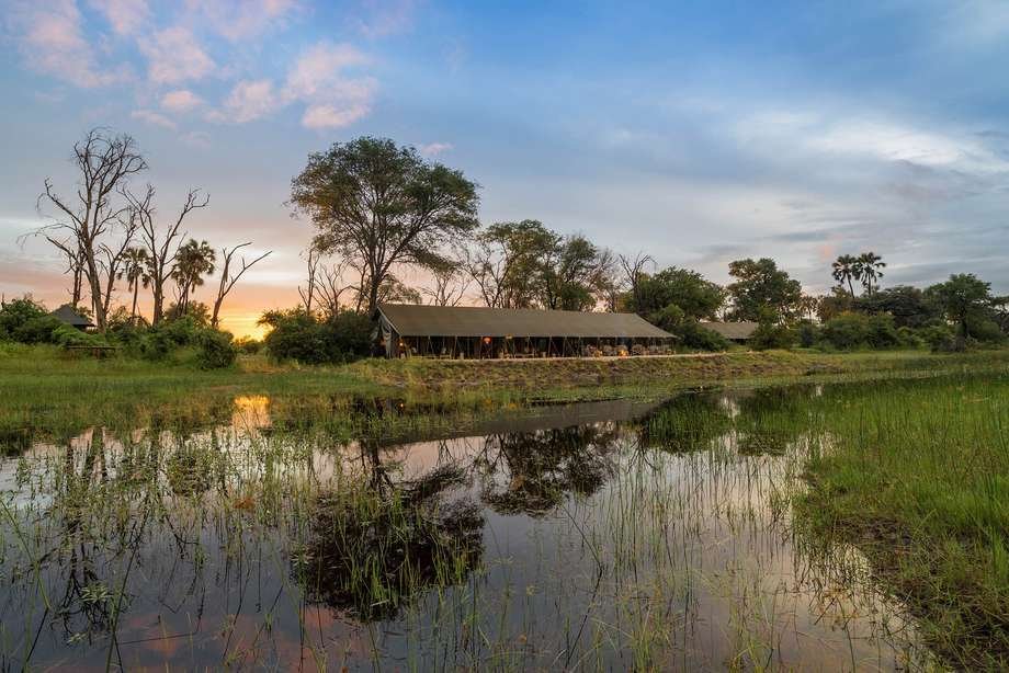 Wasser-/Land-Camp (saisonal). Traumhaft auf einer Sandbank direkt am Ufer des Gomoti Flusses gelegen. Das Camp wurde im Schatten von Palmen und Bäumen erbaut. Die private Konzession ist unter anderem bekannt für gute Wildhund Sichtungen.