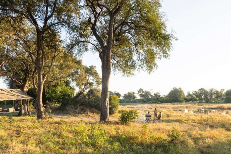 Umgeben von kleinen Galeriewäldern liegt das Camp idyllisch am Ufer von flachen Kanälen, die sich zu Zeiten des Hochwassers, meist im Juni und Juli, zu weiten Wasserflächen ausdehnen. Vor dem offenen Gemeinschaftszelt brennt morgens und abends ein wärmendes Feuer. Die Einrichtung ist schlicht und dennoch komfortabel. Auf dem Boden werden eine Plane und Teppiche ausgebreitet und gemütliche Kissen laden zum Verweilen ein. Die Mahlzeiten werden aus frischen Zutaten am offenen Feuer zubereitet.
