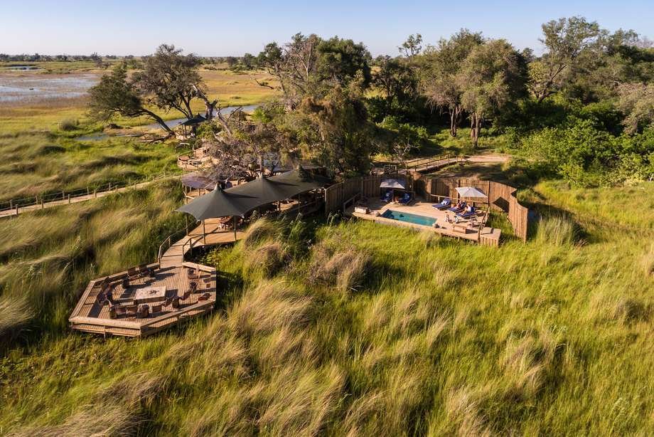 Wasser-/Land-Camp (saisonal). Das Camp befindet sich auf einer kleinen Insel, in einer privaten Konzession im nördlichen Okavango Delta. Büffel- und Elefantenherden ziehen häufig zwischen den Inseln umher und hier werden auch häufig afrikanische Wildhunde und Leoparden beobachtet.