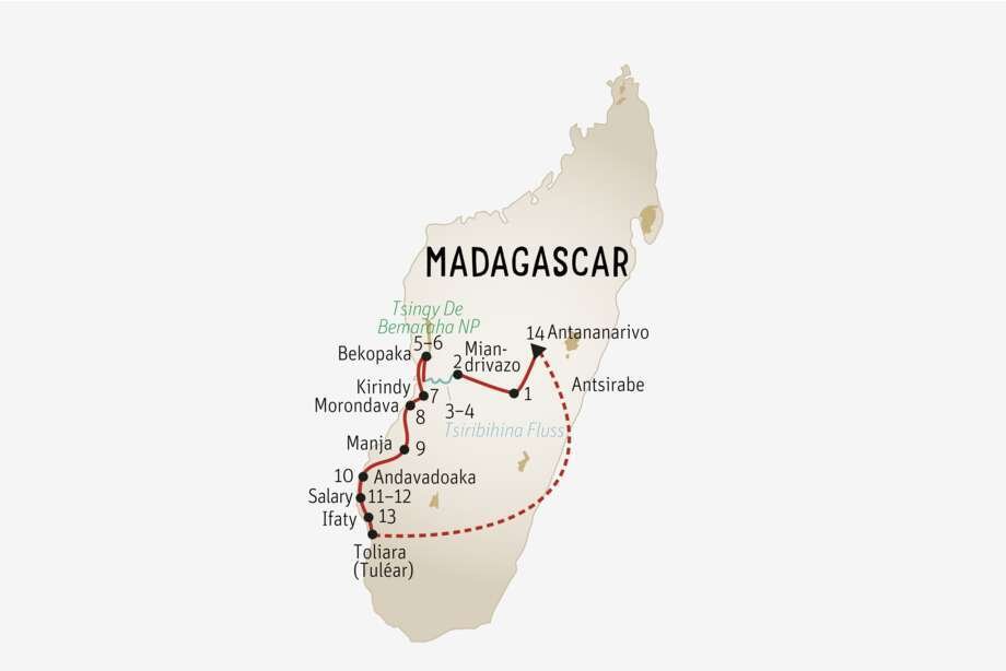| Gültigkeit der Preise: 1.12.24–30.11.25 (unter Berücksichtigung der saisonalen Öffnungszeiten) ¦ Zuschlag deutsch oder italienisch sprechender Reiseleiter: CHF 393.– pro Person. Flugtransfer Toliara-Antananarivo: ca. CHF 375.– pro Person. | |