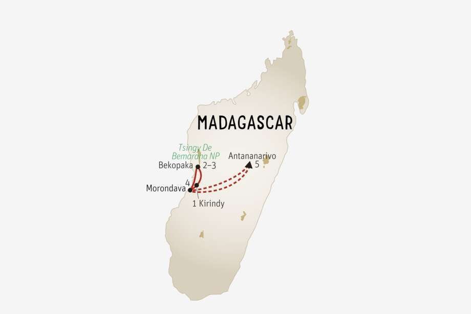 1. TAG: Antananarivo–Morondava–Kirindy. (± 60 km). Flug mit Air Madagascar ins sogenannte «Land der Baobabs». Nach der Landung werden Sie abgeholt und Sie ins Kirindy Reservat gefahren. Abends besuchen Sie das Reservat und halten nach den nachtaktiven Tieren Ausschau. Die Wälder beheimaten unter anderem die scheuen Fossa, die einzige auf Madagaskar vorkommende Raubtierart. Sie sind allerdings sehr selten zu beobachten. Übernachtung Relais de Kirindy o. ä. (MA)