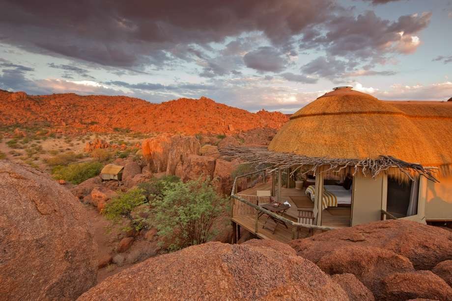 Die strohgedeckten Hütten des Hauptbereichs zeigen den Stil eines afrikanischen Dorfes auf und sie beherbergen den geschmackvoll eingerichteten Speisesaal, die Lounge sowie die Bar. Der Swimmingpool ist gekonnt in die Felsen gebaut und vom Deck bietet sich ein atemberaubender Blick in die karge Landschaft. Auf einem der mächtigen Felsen sind Sitzkissen drapiert – kein Ort eignet sich besser für das Zelebrieren der spektakulären Sonnenuntergänge.