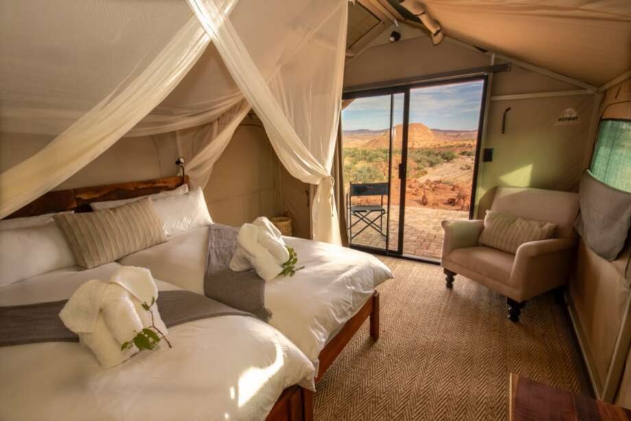 Die komfortablen Safarizelte im Meru-Stil sind mit bodentiefen Fenstern, gemauertem Badezimmer mit Dusche und Ventilator ausgestattet. Die private Veranda bietet herrliche Ausblicke auf die Wüstenlandschaft.