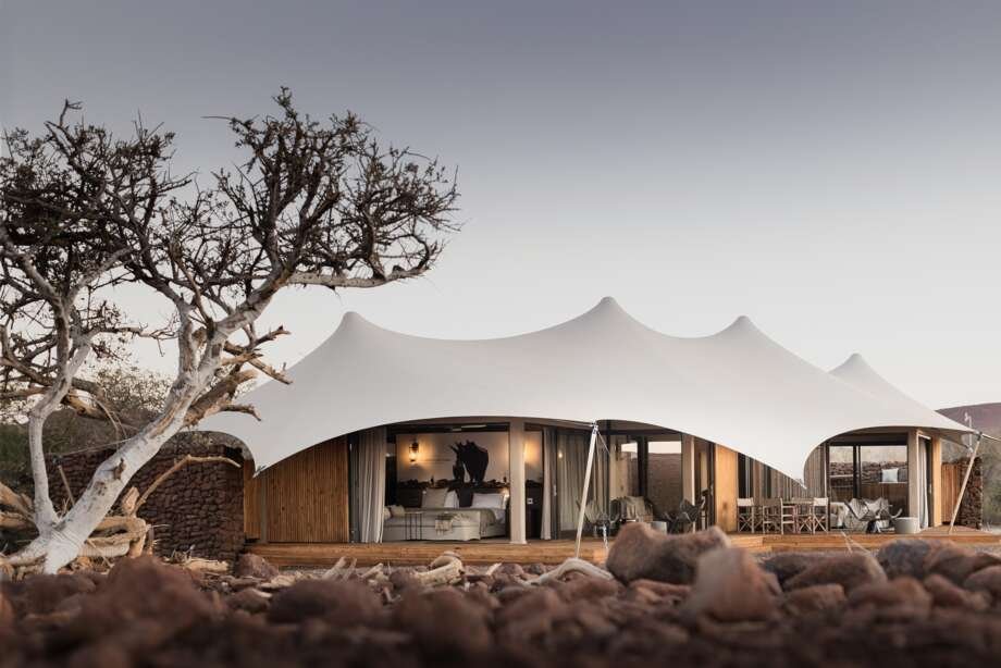 Das Camp ist seit jeher bekannt für seinen Naturschutz, speziell zum Schutz des vom Aussterben bedrohten Spitzmaulnashorns und seiner Partnerschaft mit dem «Safe the Rhino Trust». Die sanften Farbtöne der Inneneinrichtung und die klassischen Details aus Holz und Leder vermitteln das Gefühl eines geschützten Zufluchtsortes mitten in der Wüste. Hauptbereich mit gemütlichen Sitzbereichen, Essbereich und einem Swimmingpool.