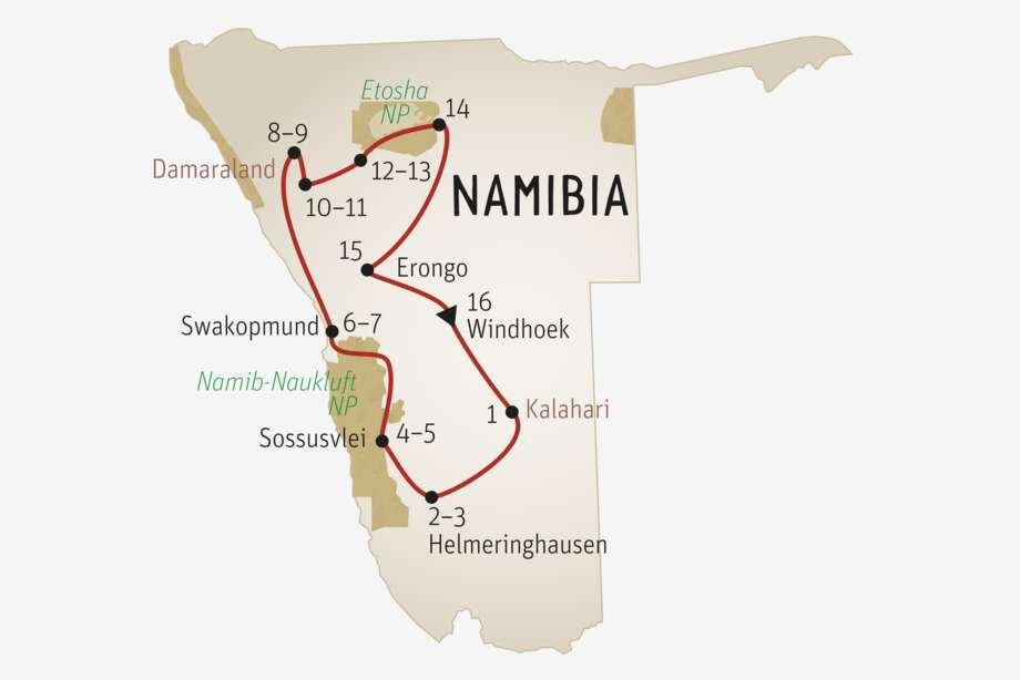 15. TAG: Etosha Nationalpark–Erongo. (± 456 km). Sie fahren weiter in die Region Erongo. Am Nachmittag haben Sie die Gelegenheit, eine geführte Wanderung zu unternehmen um die atemberaubende Landschaften zu geniessen. Übernachtung Bronze Ai Aiba Rock Lodge Lodge o. ä. (FA) Silver Gold Epako Safari Lodge o. ä. (FA)