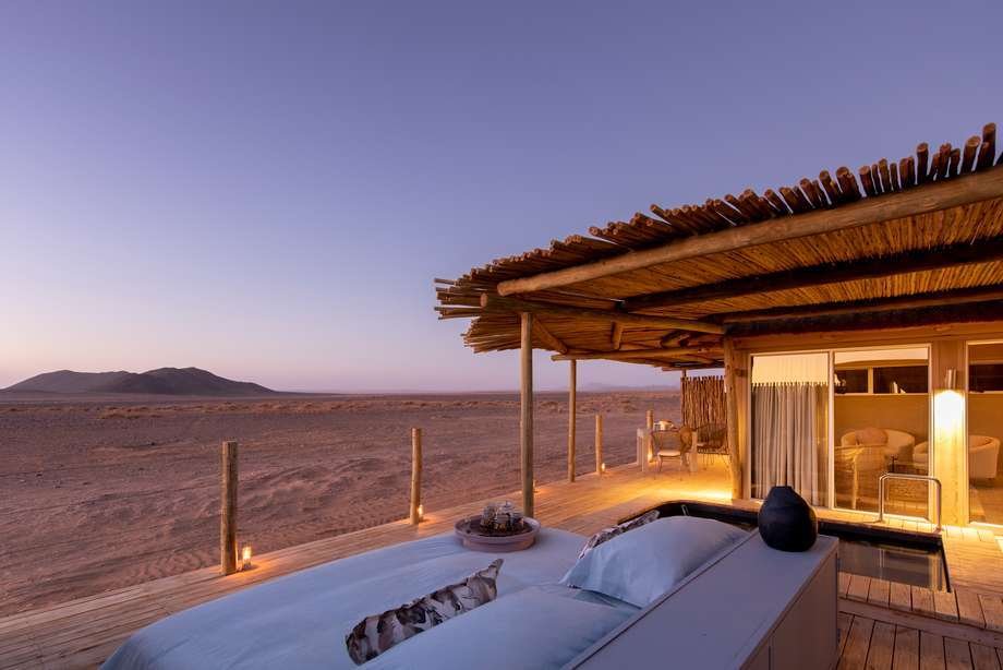 Zimmer: 11. Die luxuriösen Villen sind geschickt in die Umgebung integriert. Von der Wüste sind Sie nur durch eine verglaste Fensterfront getrennt und haben so eine fantastische Weitsicht. Bad/Dusche und Aussendusche, Klimaanlage/Ventilator, Minibar, Safe, Terrasse und Planschpool. Unvergesslich, die Nacht unter dem namibischen Sternenhimmel. Übernachten Sie im komfortablen Bett des Sleep Outs auf Ihrer Terrasse. Kinder ab 6 Jahren.