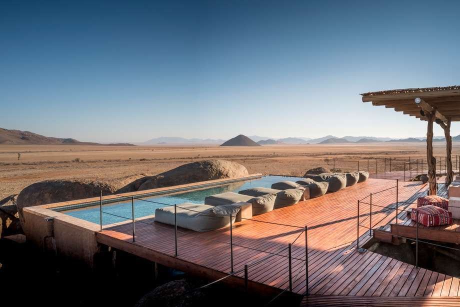 Auf einer Anhäufung von Granitfelsen, in ca. 30–40 Meter Höhe erbaut. Das Camp liegt am südlichen Ende der Namib Wüste, zwei Autostunden von den roten Dünen von Sossusvlei entfernt.
