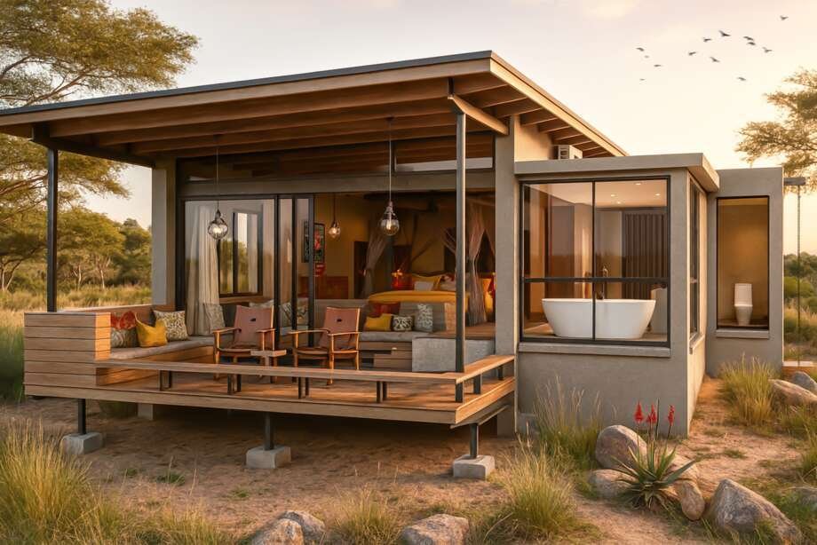 Die Safari Suiten sind von Naturerlebnis und Grosszügigkeit geprägt. Bodentiefe Glasfronten sorgen dafür, dass Sie überall – ob im Bett, in der versenkten Lounge, in der Badewanne, unter der Dusche oder sogar auf der Toilette – stets mit der Natur verbunden bleiben. Die Suite sind im afrikanischen Stil gehalten und verfügen über Klimaanlage sowie eine private Terrasse mit Blick in den Busch.