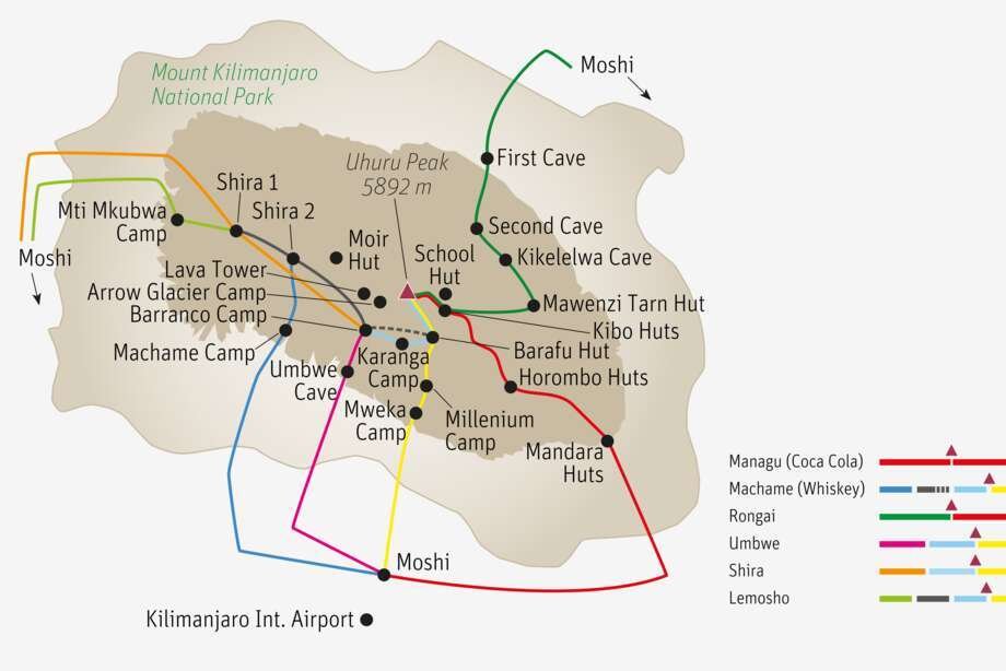 Die gängigsten Routen sind die Marangu und die Machame Route, sie sind auch bekannt unter den Namen Coca Cola und Whiskey Route. Jedes Trekking hat seine einzigartigen Höhepunkte und Eigenschaften. Bei jeder Route kann ein Akklimatisierungstag hinzugefügt werden und die erste und letzte Nacht wird jeweils im Basishotel verbracht.