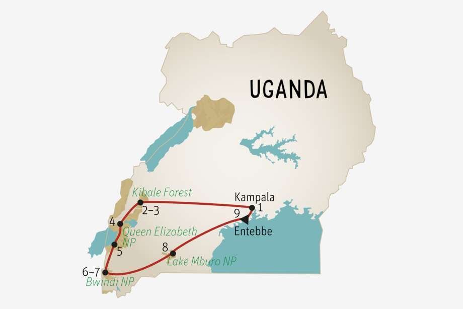 2. TAG: Kampala–Kibale Forest. Durch afrikanische Dörfer und eine liebliche, mit unzähligen Hügeln durchsetzte Landschaft fahren Sie in die Region des Kibale Forest. Übernachtung Silver Turaco Treetops Lodge o. ä. (FMA) Gold Kyaninga Lodge o. ä. (FMA)