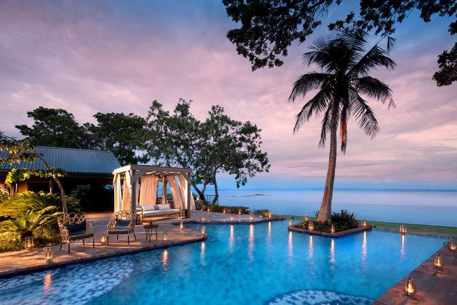 An exponierter Lage auf einer Hügelkuppe oberhalb des Kariba Stausees. Nicht selten können am Ufer Elefanten entdeckt werden, die sich im Wasser tummeln.
